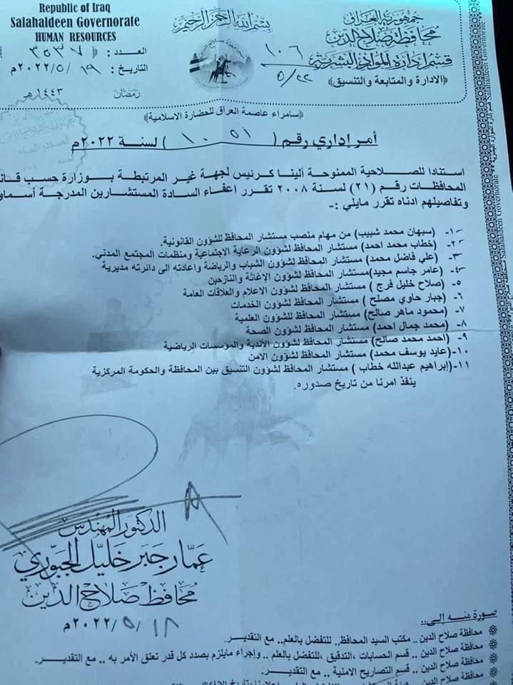 رغم إقالته.. محافظ صلاح الدين يعفي 11 شخصاً من مستشاريه (وثيقة)