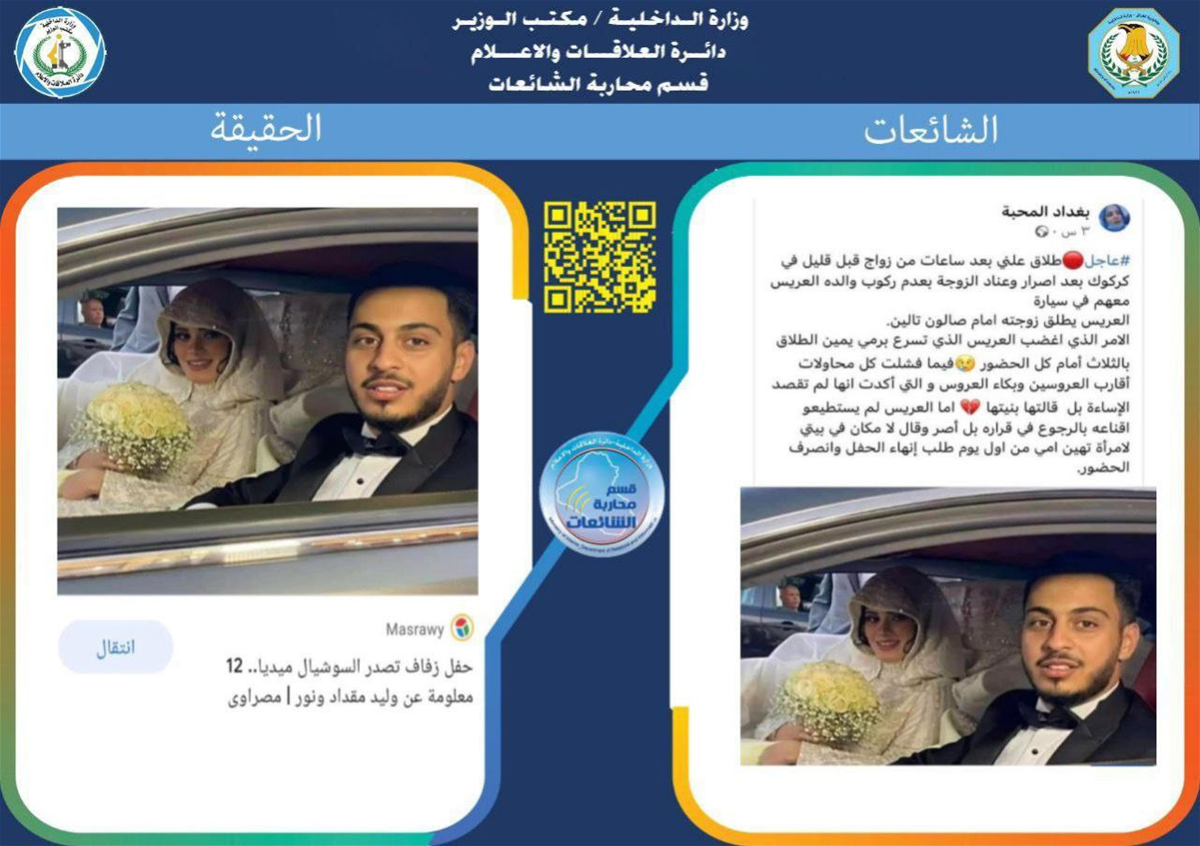 وقالت القسم في بيان ورد للسومرية ، "تناولت مواقع التواصل الاجتماعي خبر نصه (اسرع حالة طلاق بعد ساعات من زواج في محافظة كركوك) وبعد البحث عن الخبر المتداول وبالتنسيق مع