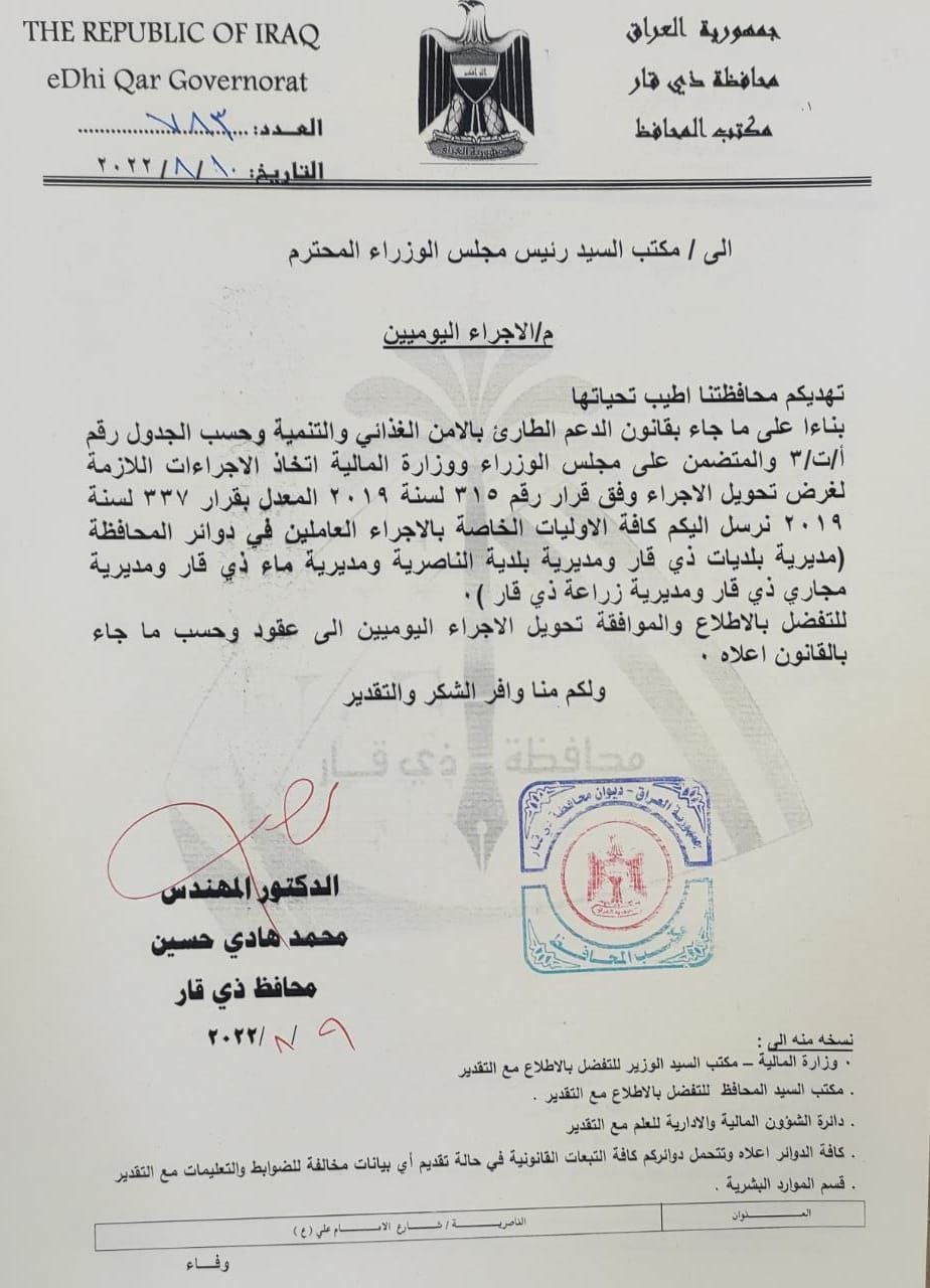 ووزارة المالية، لغرض الموافقة على تحويلهم الى عقود حسب قانون الامن الغذائي".