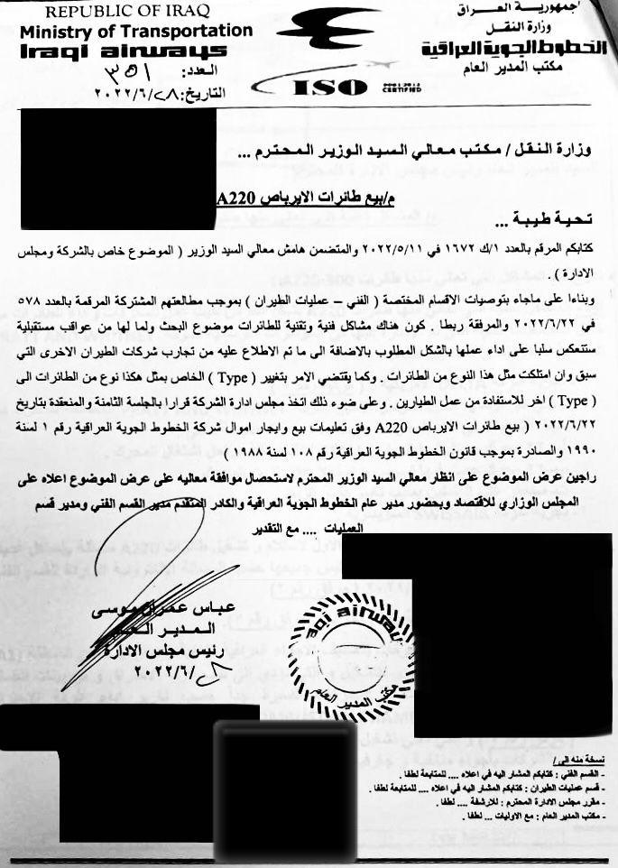ان "تصريحات الوزير الاخيرة بخصوص الطائرتين من طراز A220 والتي سبق للخطوط الجوية العراقية ان تعاقدت عليها في العام ٢٠١٣ هذه التصريحات عارية عن
