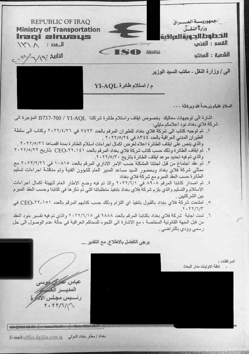 وان اجراءات الخطوط جرت جميعها بعلم الوزير وموافقته وفقا لكتاب الخطوط المرقم ٣٥١ في ٢٨ / ٦ / ٢٠٢٢ والمعزز بقرار مجلس ادارة الشركة والذي يملك صلاحيات كاملة في اتخاذ قرارات تخص الشركة حصرا ولذلك فان اجراءات
