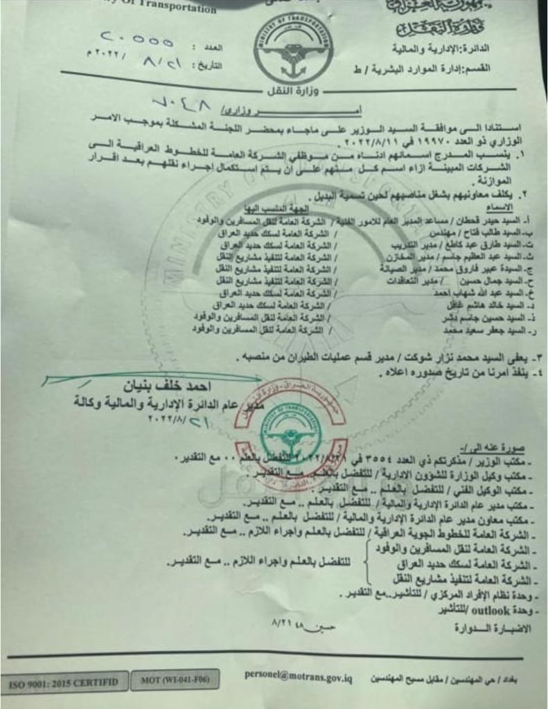 بالوثيقة.. وزير النقل يجري تنقلات لخيرة مهندسي الطائرات