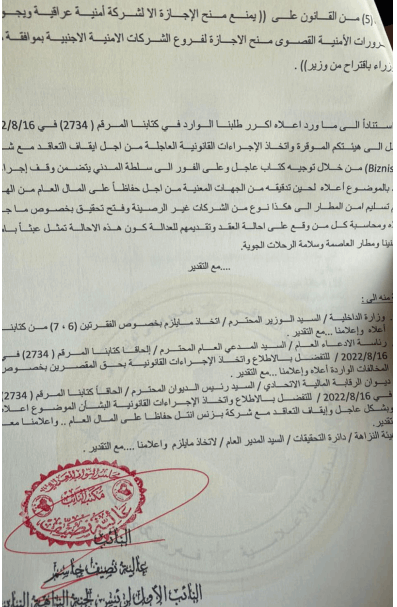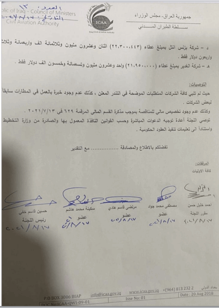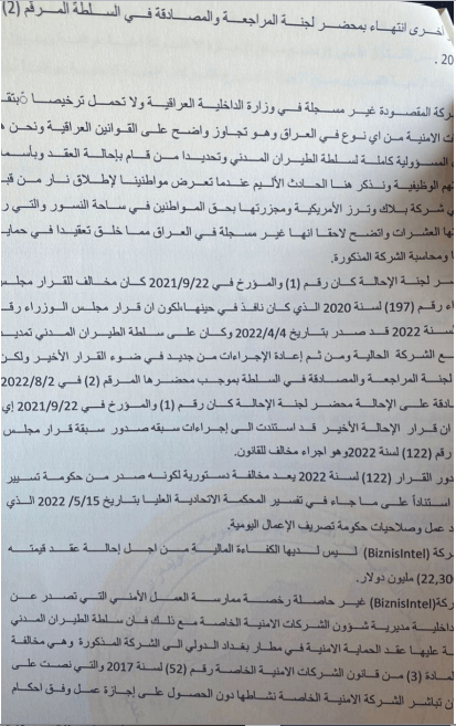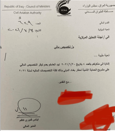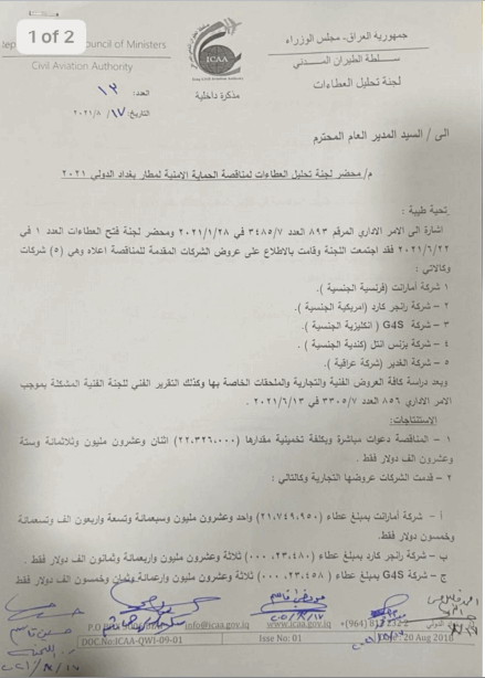 وأضافت، أنه "سبق وأن قامت لجنة تحليل العطاءات بموجب محضرها المرقم 13 ، بإعادة توجيه الدعوات المباشرة بخصوص مناقصة الحماية الأمنية لمطار بغداد الدولي بسبب عدم وجود خبرة بالعمل في المطارات وكذلك عدم توفر التخصيص المالي بحسب مضمون مذكرة القسم".
