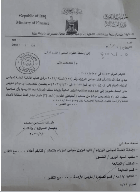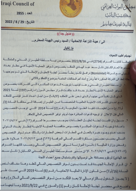 والذي ينص على التعاقد مع "الاياتا" من أجل اعداد تندر قياسي للتعاقد مع احدى الشركات الأمنية العالمية المتخصصة بأمن الطيران بالإضافة إلى مخالفة المادة (2/أولا/ج) من تعليمات تنفيذ العقود الحكومية التي توجب التخصيص المالي قبل الإعلان أو توجيه الدعوات المباشرة حيث لم يتم توفير التخصيص المالي للتعاقد".