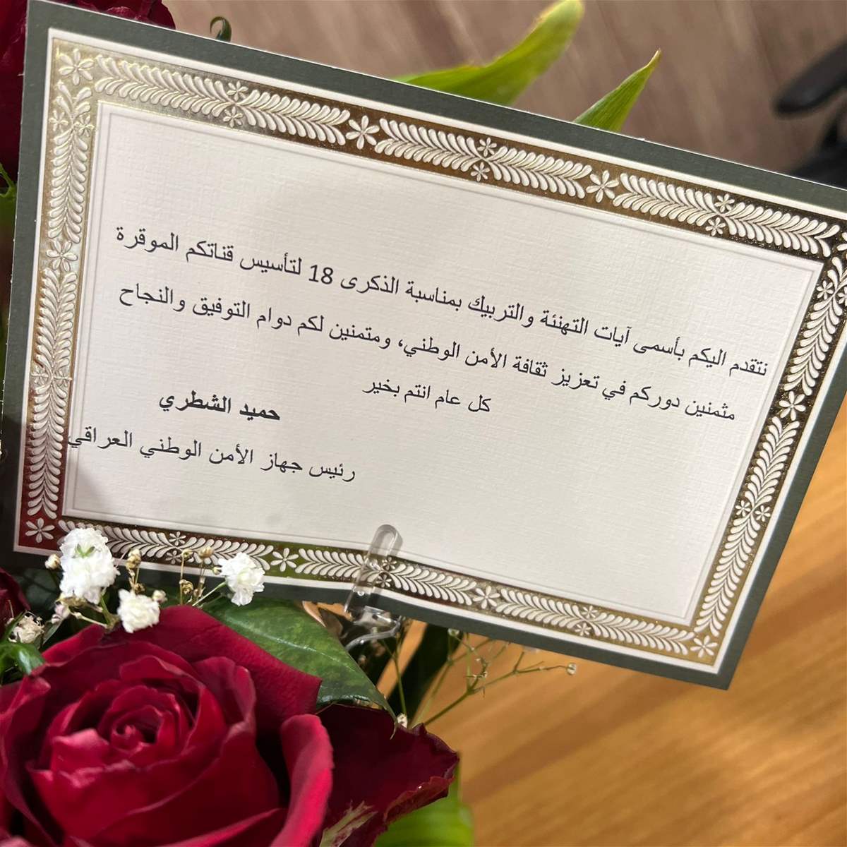 كتب فيها: "نتقدم اليكم بأسمى آيات التهنئة والتبريك بمناسبة الذكرى الثامنة عشر لتأسيس قناتكم الموقرة، مثمنين دوركم في تعزيز ثقافة الامن الوطني، ومتمنين لكم دوام التوفيق والنجاح".