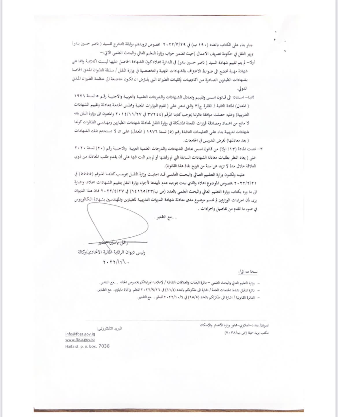 في كتابه المرقم (10/40/1/22194) في 10/10/2022 بعدم صحة الاجراءات الخاصة بقيام وزير النقل (ناصر حسين بندر) بمنح نفسه للشهادة الجامعية، وإن الكتاب اعلاه قد جاء إجابة على مضمون مخاطبات سابقة بين النائب والديوان بخصوص الموضوع وقامت نصيف في وقت سابق بإحالة الملف بكامله الى