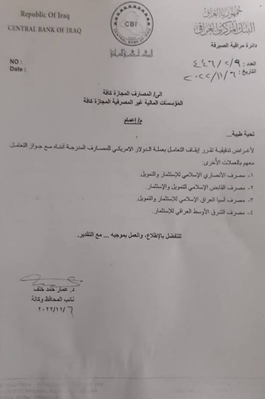 وأضاف المصدر أن "هذا الأمر لا يشمل تعامل هذه الجهات بالدينار العراقي".