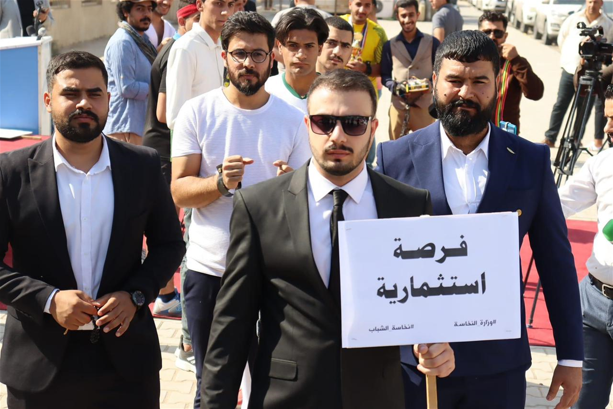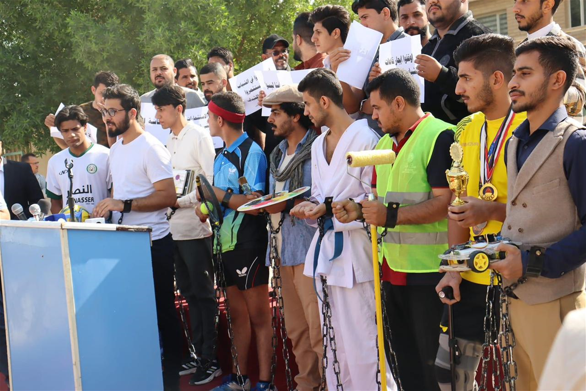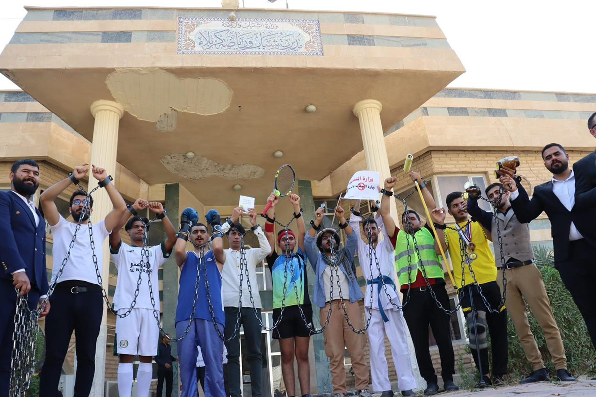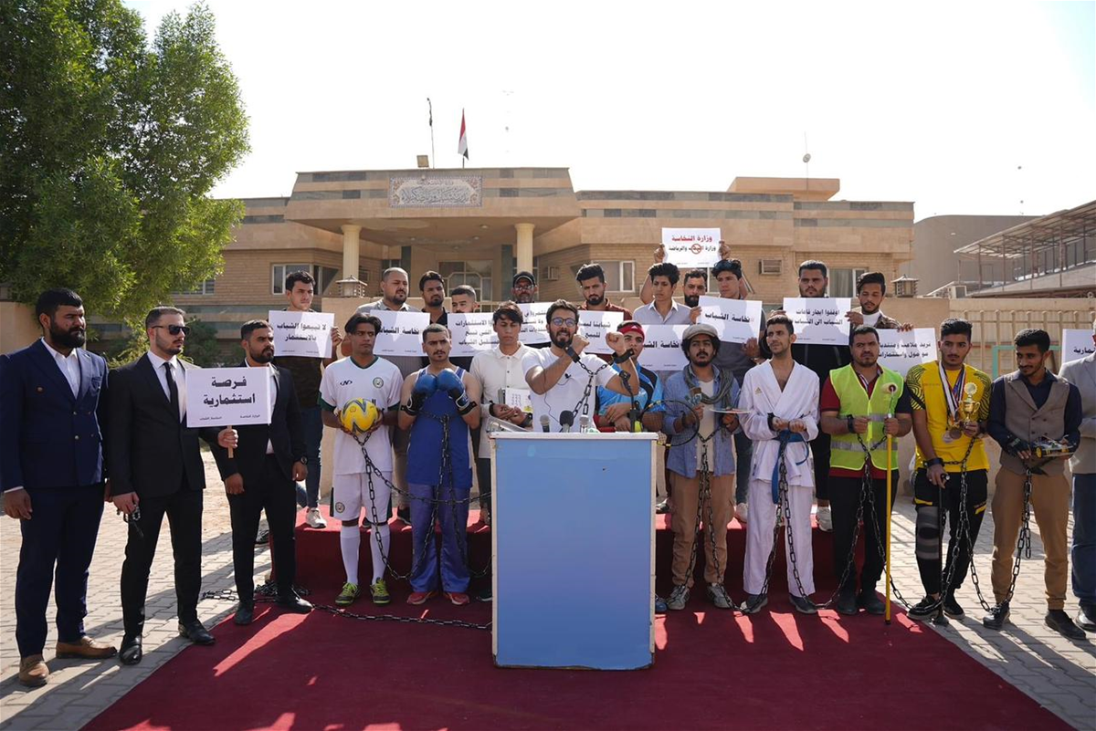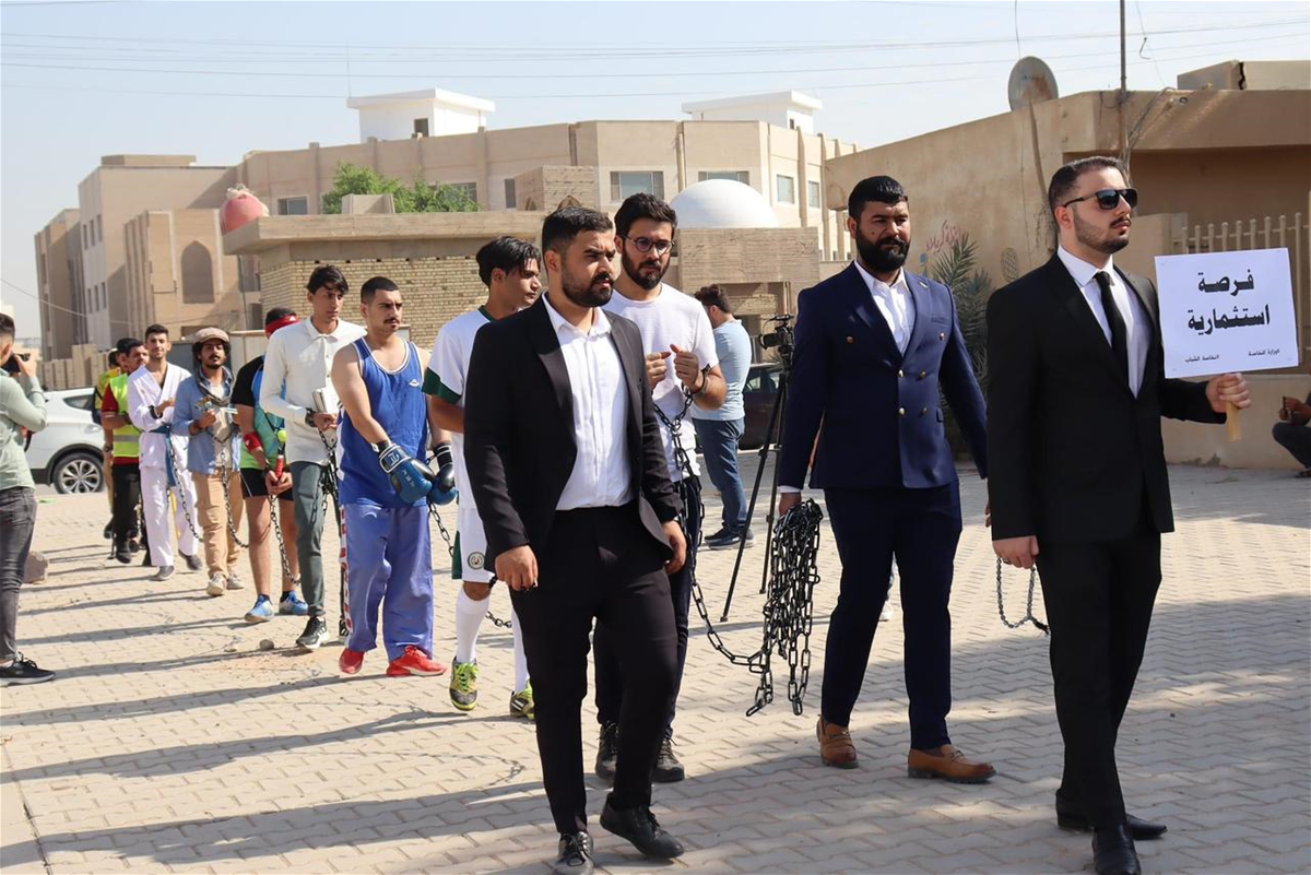 جاء ذلك بحسب المحتجين بعد ان "ذاق الشباب مرارة اعطاء منشآتهم الى الاستثمار وتحويلها الى مولات وكوفيات ومجمعات خرجوا اليوم بوقفة استثنائية وهم مقيدين بالسلاسل كما في اسواق العبيد قبل الجاهلية رافضين عرضهم للبيع، مطالبين بايقاف الاستثمارات وتفعيل (ملف الشباب) في الوزارة والمديرية".
