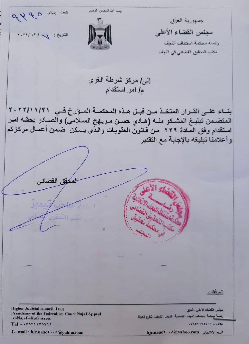 ، والصادر بحقه أمر استقدام وفق المادة 229 من قانون العقوبات العراقي، والذي يسكن ضمن أعمال مركزكم وإعلامنا تبليغه بالإجابة مع التقدير".