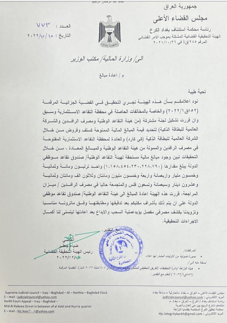 المختصة بقضايا النزاهة إعادة مبلغ قدره تريليون واحد و١٥٨ مليار دينار بعد تحقيقات اجريت في المخالفات الحاصلة في محفظة التقاعد الاستثمارية".