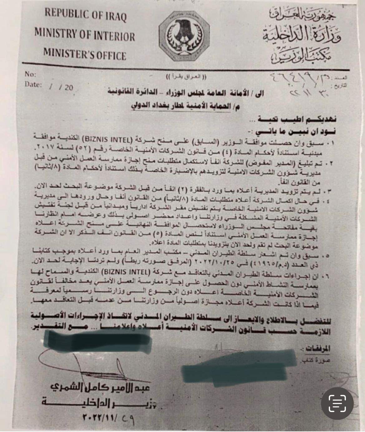 الى ذلك، قال مصدر مقرب من اللجنة التحقيقية ان "مديرية الشركات الامنية في وزارة الداخلية لديها صلاحية وفق القانون وبدون شكوى جزائية تستطيع هذه الدائرة تغريم شركة بسنز انتل مبلغ ١٠٠ مليون دينار وكذلك حبس المدير المفوض للشركة لممارستها العمل الامني بدون رخصة مسبقة صادرة من مديرية الشركات الامنية"، داعية الادارة الحالية الى "تصحيح الوضع بخصوص هذه الخروقات الجسيمة".