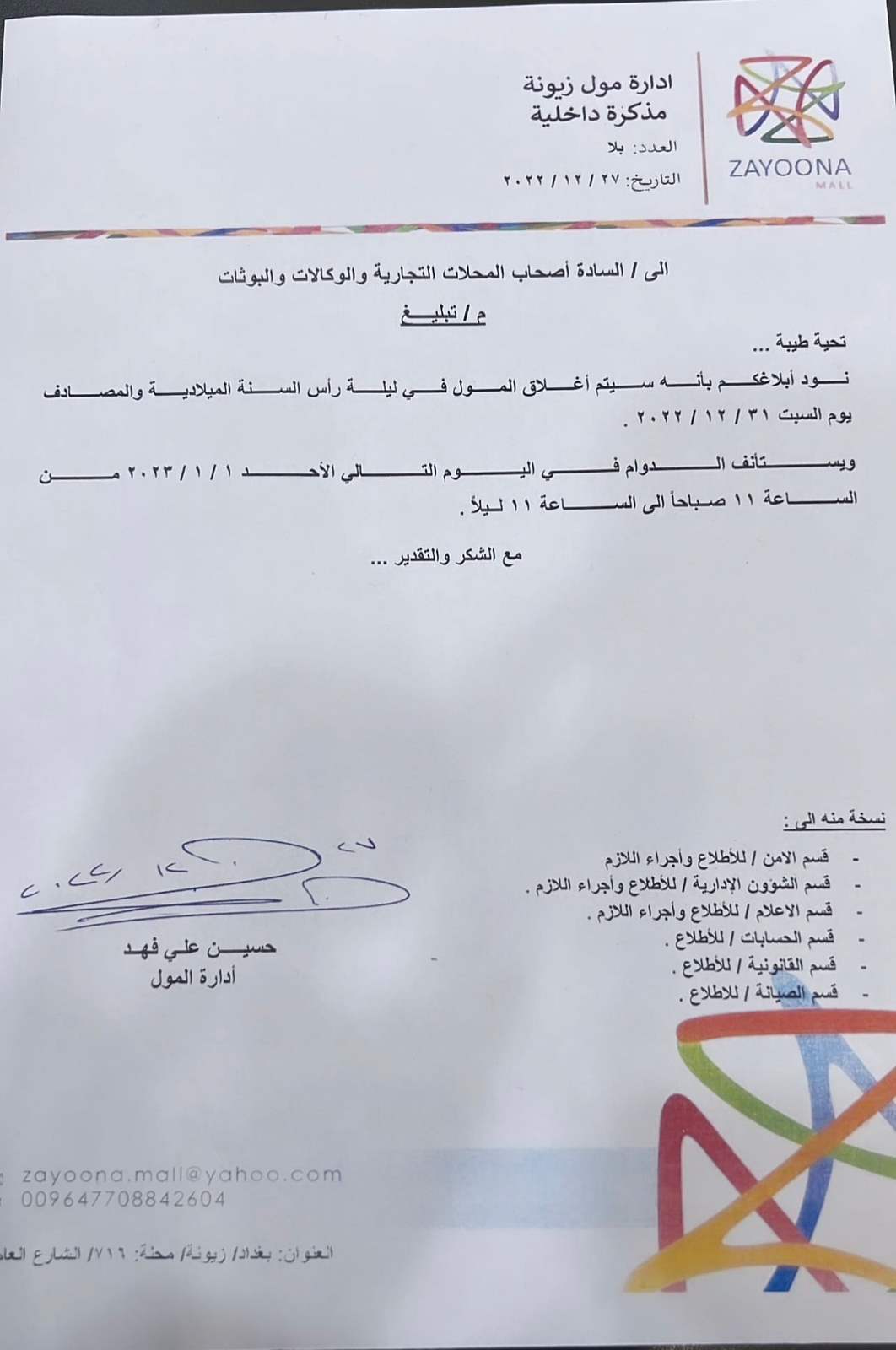 ، "نود إبلاغكم أنه سيتم إغلاق المول في ليلة رأس السنة الميلادية والمصادف يوم السبت 31 كانون الأول 2022".