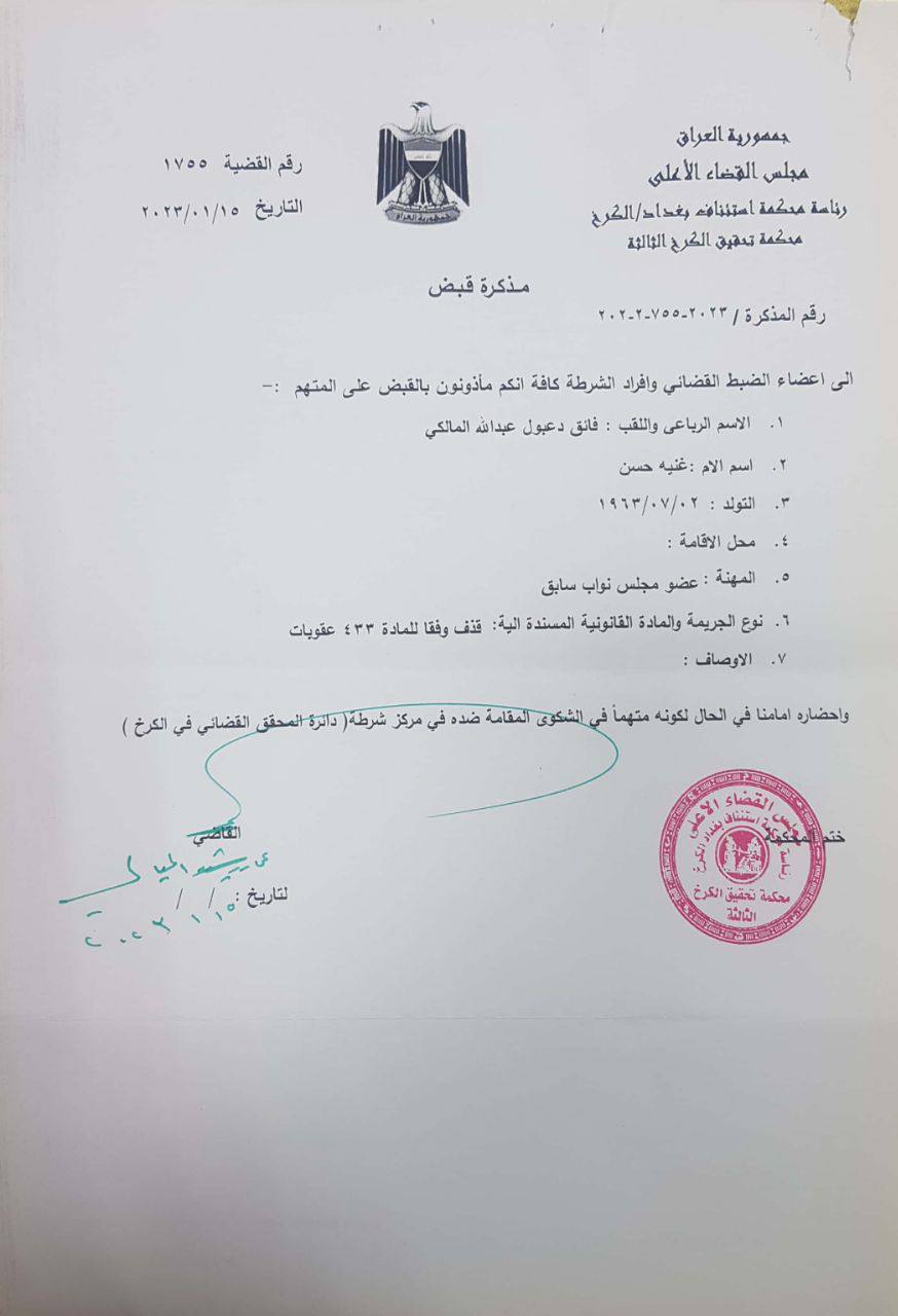 وفي عام 2020، أصدر القضاء العراقي، قرارا بإلقاء القبض على