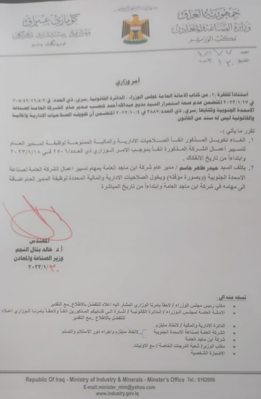 اعفاء مدير عام شركة الاسمدة الجنوبية وتكليف بديلا عنه (وثيقة)