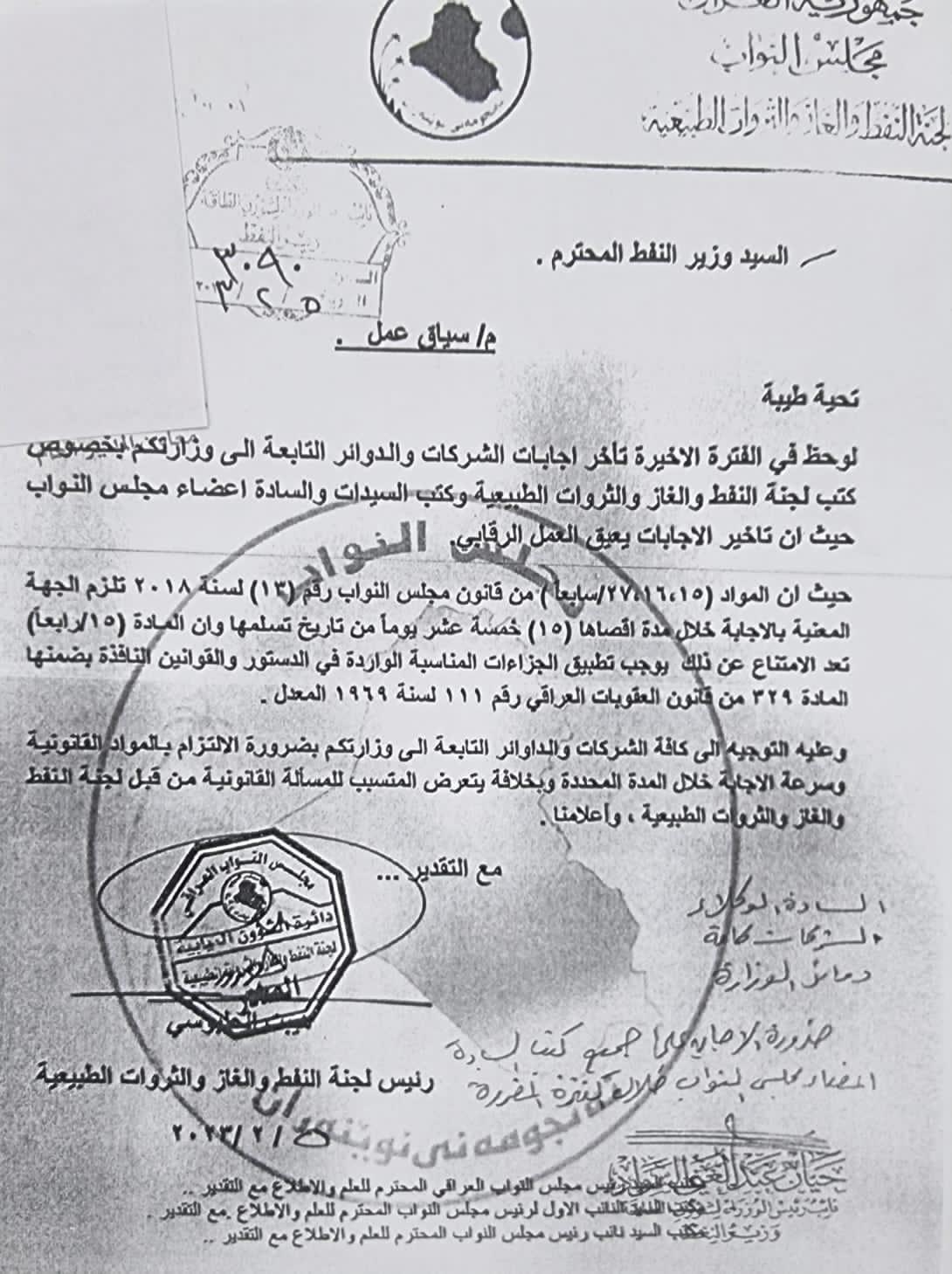 الطاقة النيابية تخاطب وزير النفط بخصوص الأسئلة البرلمانية (وثيقة)