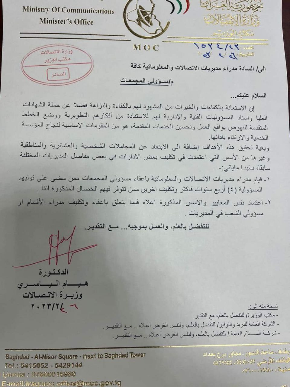 الاتصالات تعفي مسؤولين بالوزارة وتكلف آخرين (وثيقة)