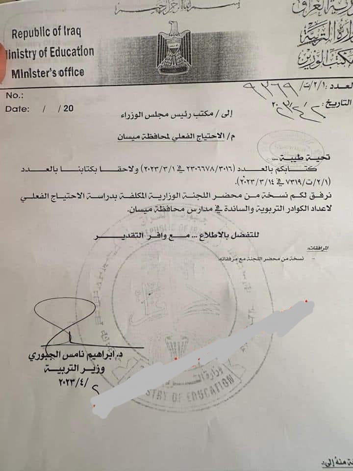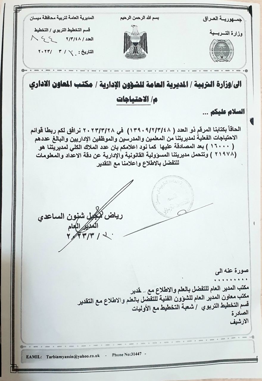 وأردف، "اتضح من خلال اللجنة التي شكلها ان عدد النص هو 16 ألف تربوي وإداري بحاجة الى مدارس المحافظة، وبعد رفع التقرير الى وزارة التربية خاطب وزير التربية رئيس الوزراء بكتاب رسمي والى الآن منذ 65 يوم لم نجد إجابة على كتابنا الخاص بالاحتياج الوظيفي لمديرية تربية ميسان".