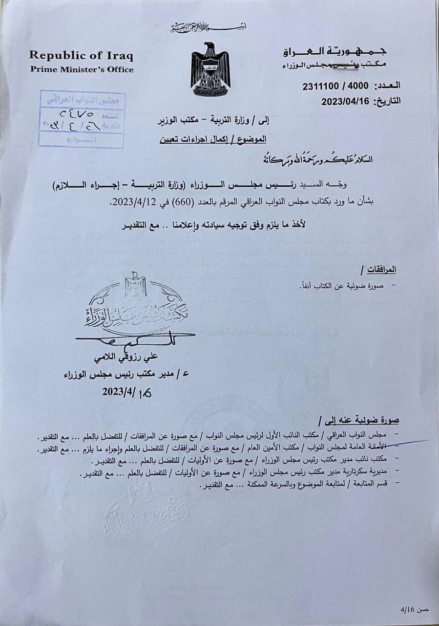الى انه "بعد محاولات من نواب محافظة ميسان للقاء رئيس الوزراء لكن دون جدوى نوجه رسالتنا ومناشدتنا الى رئيس الوزراء بالموافقة على كتاب الاحتياج الوظيفي الفعلي لمديرية تربية ميسان ليتسنى لنا سد الشاغر الحاصل بالمديرية بعقد لا يتجاوز راتبه 300 ألف دينار وهو ابسط حق من حقوق الدراسة والانتظار لسنوات".