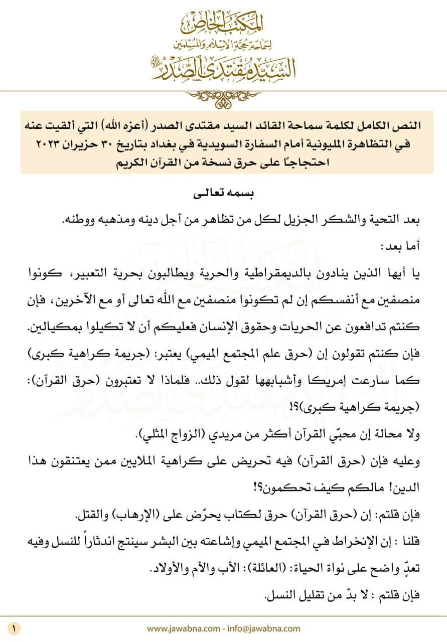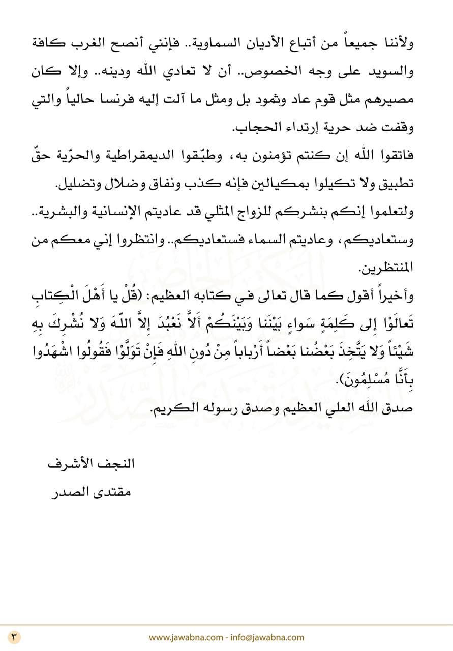وأشار زعيم التيار الصدري الى ان "الاسلام هو اسلام العفة والاصلاح والسلام والمحبة، وليس كما تسوقونه من الارهاب وغيره"، موضحا انه "يجب على الداعين للديمقراطية ان لا يتحدثوا بوجهين وان يعملوا بأسس حرية التعبير الحقيقة".