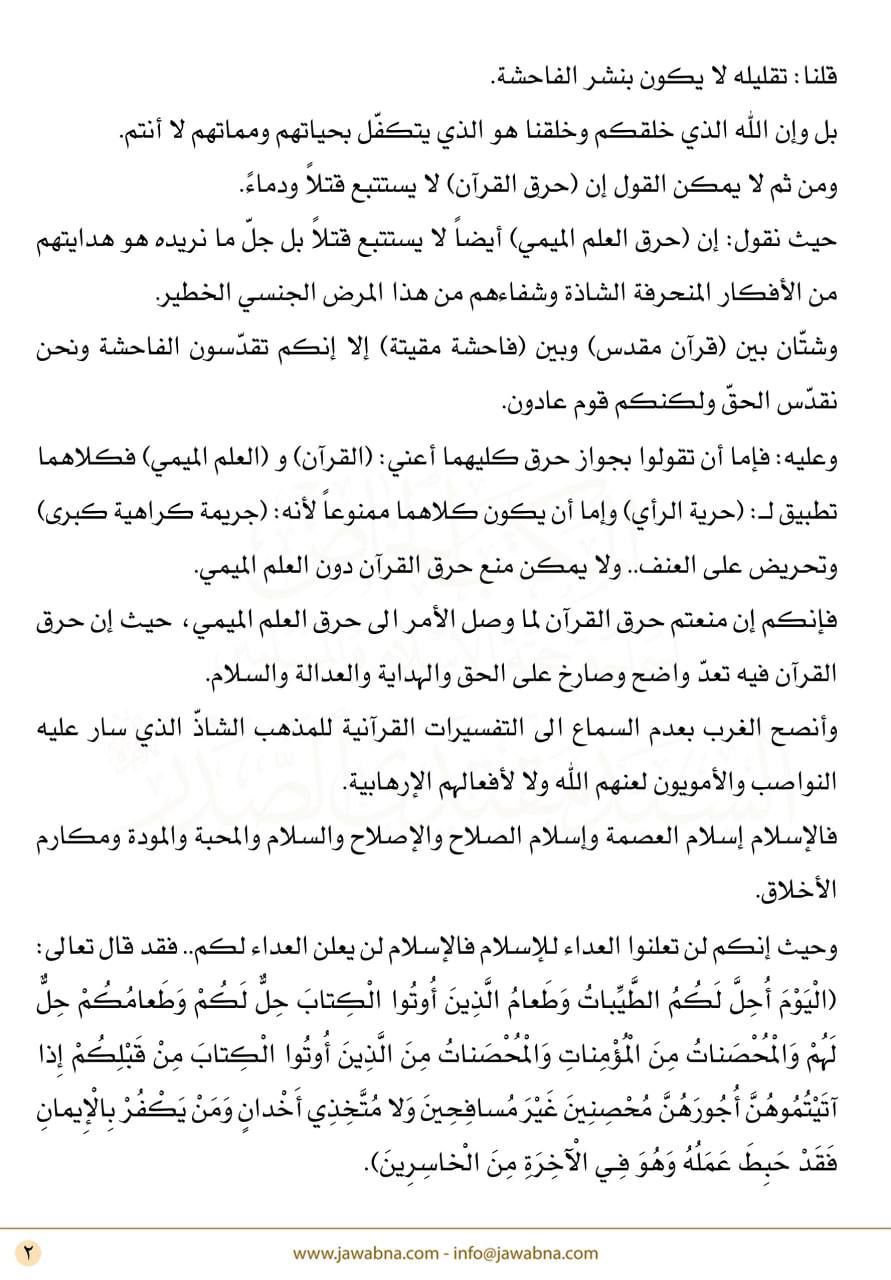 ان "حرق القران تحريض على العنف، كما انه يعتبر تجاوزاً على الهداية ".
