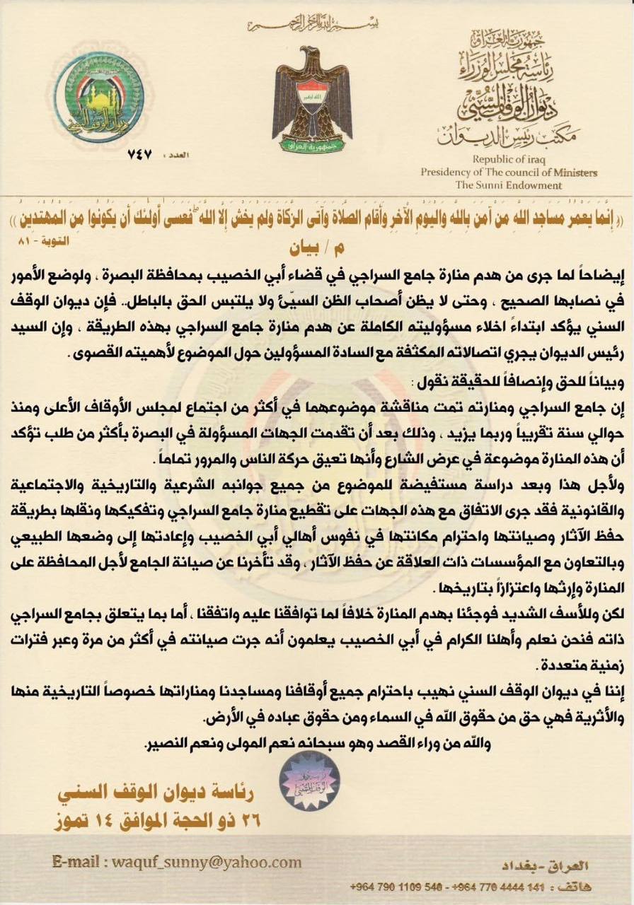 وأكمل البيان: "أما فيما يتعلق بجامع السراجي ذاته فنحن نعلم وأهلنا الكرام بأبي الخصيب يعلمون أنه جرت صيانته في أكثر من مرة وعبر فترات زمنية متعددة".