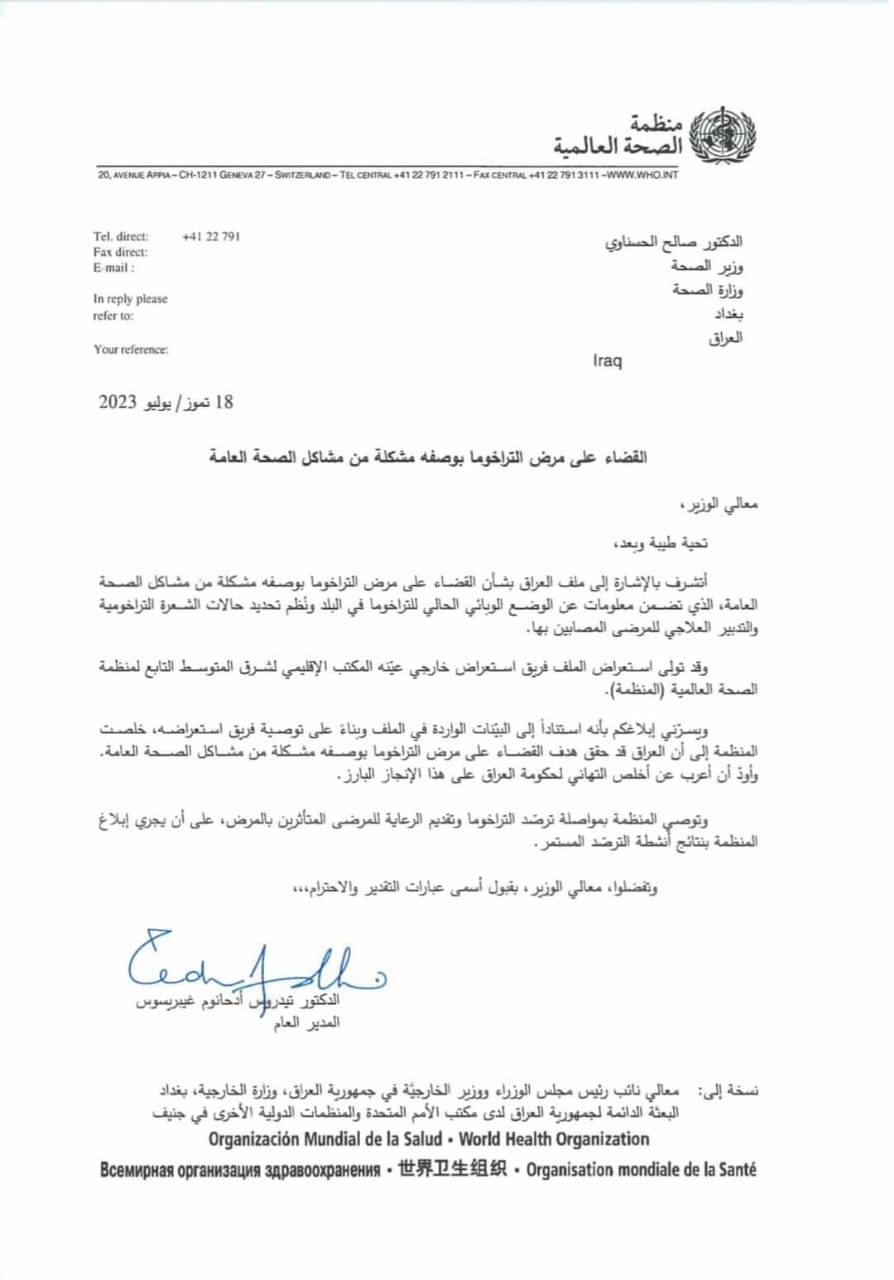 هنئ واشاد بما حققته الوزارة والحكومة العراقية من انجاز بخصوص هذا المرض كونه يعد مشكلة من مشاكل