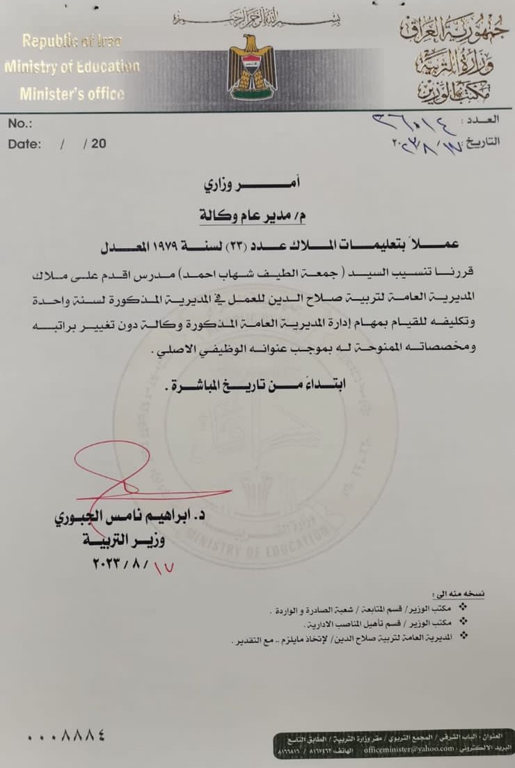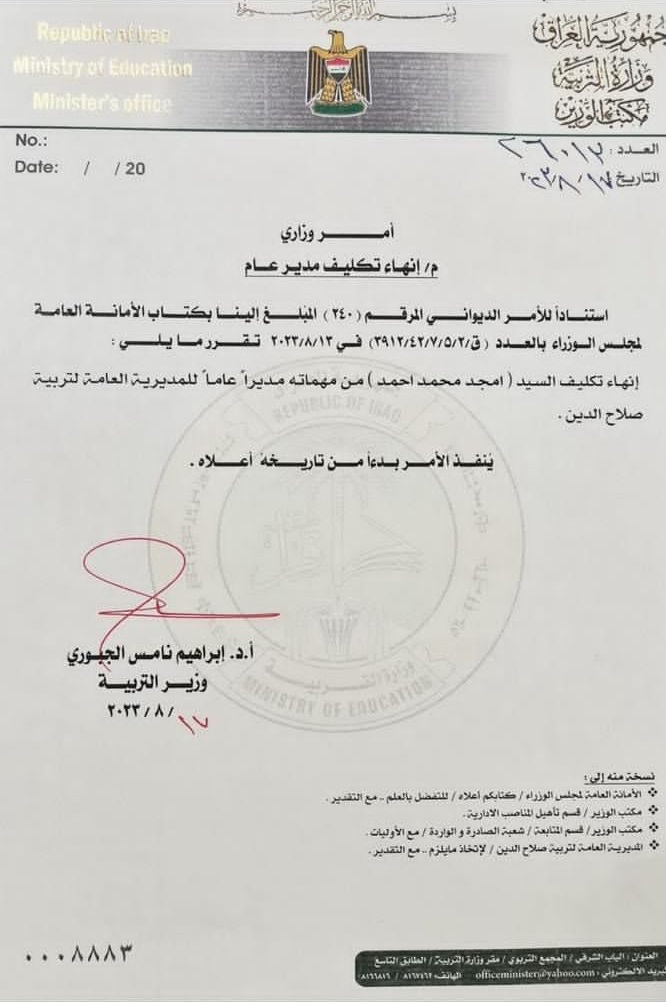 إنهاء تكليف مدير تربية صلاح الدين وتكليف بديل عنه (وثائق)