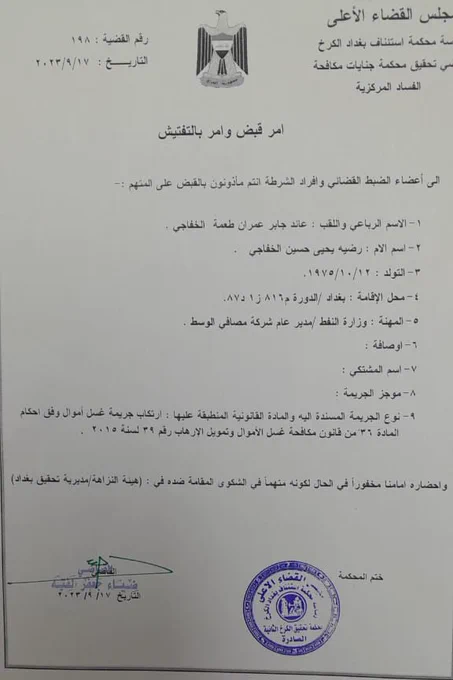 ، انه "في الوقت الذي نشكر فيه كل مَن ساهم في القبض على هذا الفاسد المجرم في عملية أمنية مشددة الليلة الماضية بتهمة الإرهاب وغسيل الأموال، نأمل أن يتم التحقيق في كافة ملفات فساده التي أعلنا عنها سابقاً وقدمناها الى الجهات المعنية ".