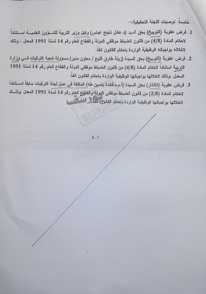 ناجح عباس وكيل وزير التربية للشؤون العلمية استنادا الى احكام المادة (8/4) من قانون انضباط موظفي الدولة والقطاع العام رقم 14 لسنة 1991 المعدل وذلك لإخلاله بواجباته الوظيفية الواردة بأحكام القانون انفا.