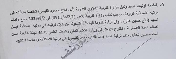 الخاصة بترقيته الى مرتبة الاستاذية الوارد بموجب كتاب وزارة التربية بالعدد (1/2/ت /3911) في 2/8/2023 مع اوليات