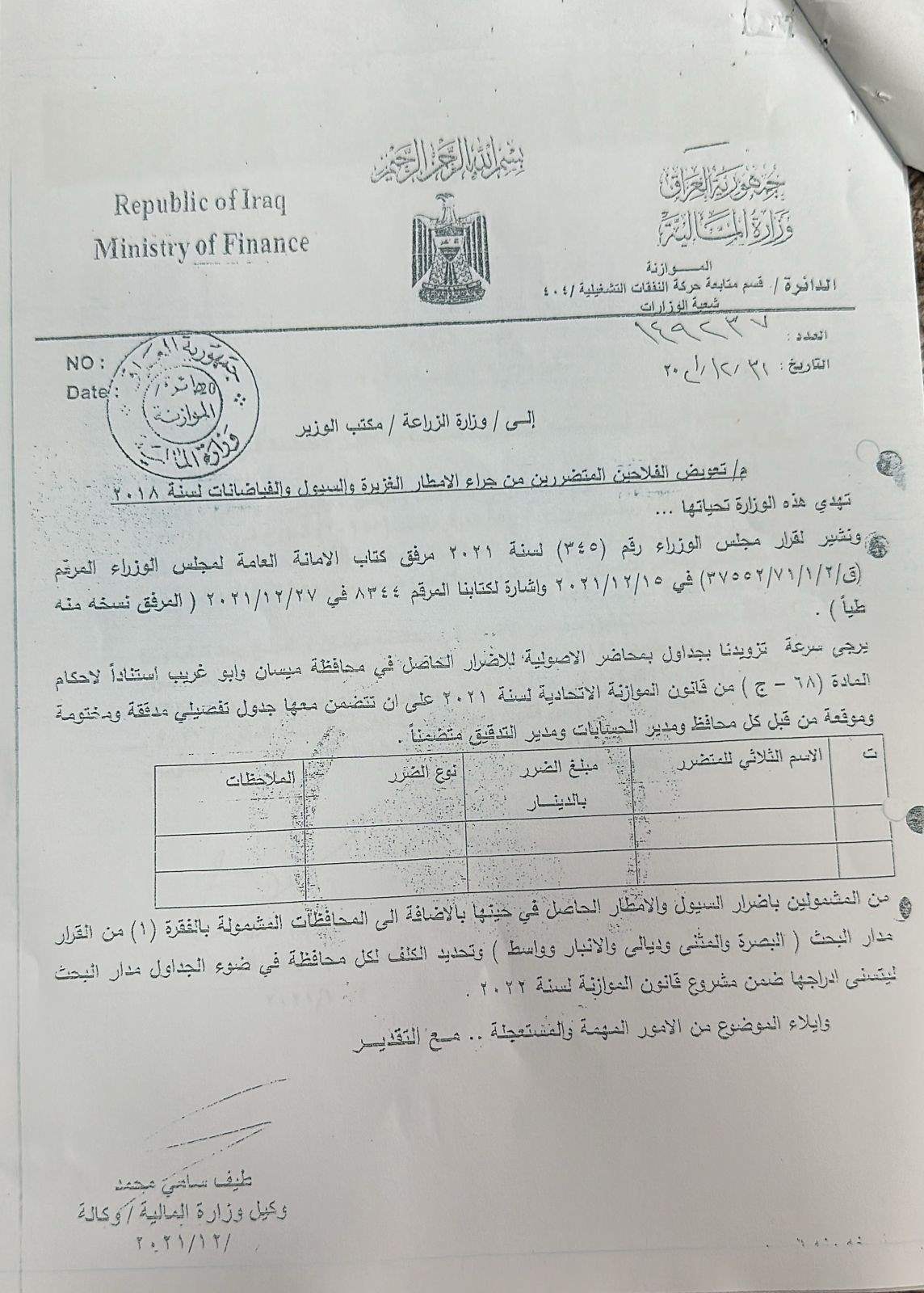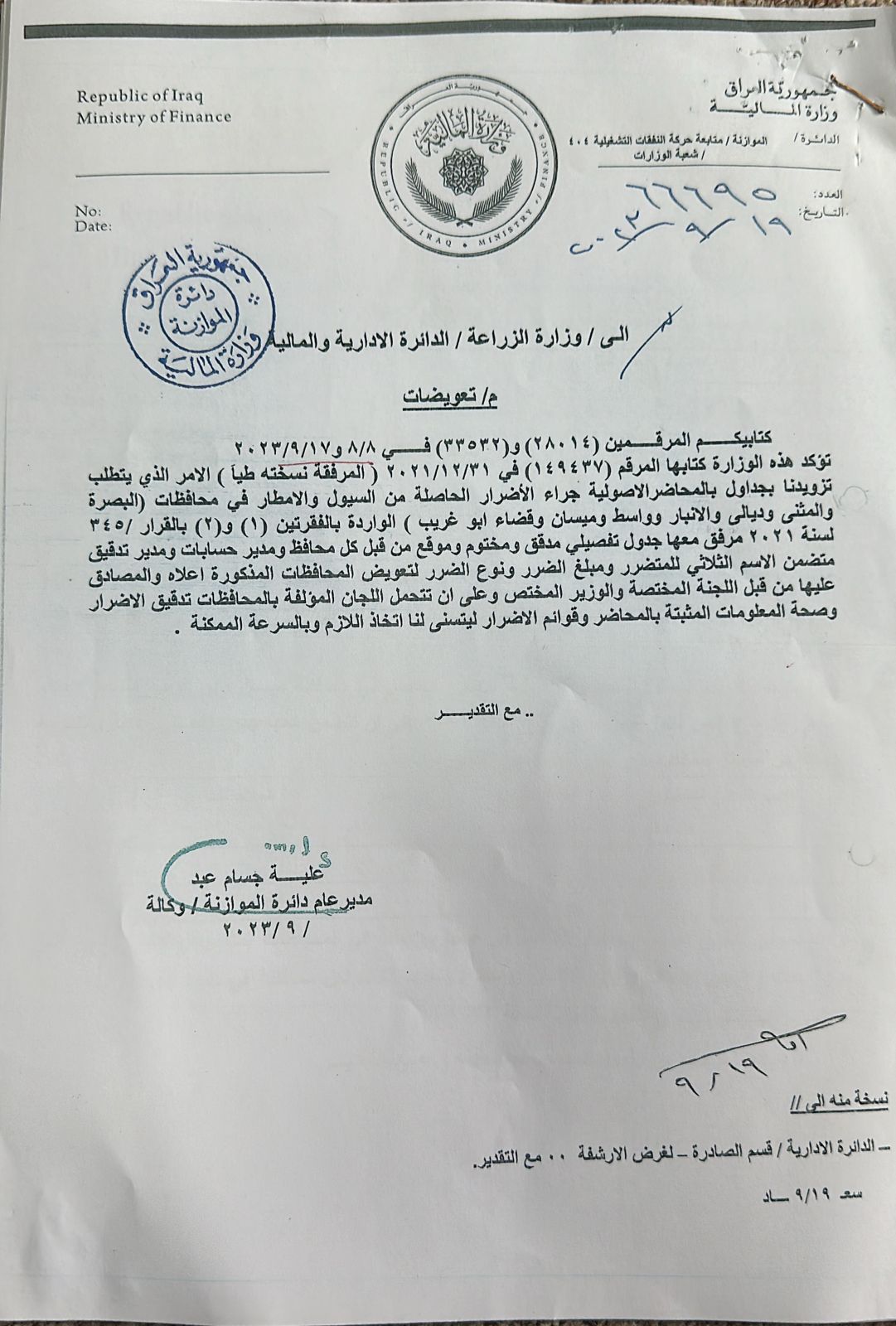 وقالت الوزارة في بيان ورد لـ السومرية نيوز، أنه "سبق وان اتخذت وزارة المالية الإجراءات اللازمة بشأن تخصيص مبلغ قدره (٢١٦) مليار دينار، عن مستحقات الفلاحين لمحافظات (ميسان ، الانبار ، البصرة ، ديالى ، مثنى ، واسط ، بغداد ، اضافة الى ابو غريب ) تنفيذا لقرار مجلس الوزراء (٣٤٥) لسنة ٢٠٢١ ، وادراج تلك التخصيصات ضمن موازنة وزارة الزراعة لسنة ٢٠٢٣". وأشارت إلى قيامها "بالطلب من وزارة الزراعة سرعة تزويدها ببيانات الفلاحين المتضررين بحسب كتابها المرقم (١٤٩٢٣) في ٣١ كانون الاول ٢٠٢١، المتضمن تزويدها بالاسم الثلاثي للمقترض ومبلغ الضرر ونوع الضرر وباقي الملاحظات ولكل محافظة على حده، مرفقة بمصادقة محضر أصل موقع من قبل المحافظ والمدير العام ومدير الحسابات والتدقيق ومصادقة وزارة الزراعة". وحرصت الوزارة، وفق البيان، "على تأكيدها الموجه لوزارة الزراعة بالكتاب المرقم (٦٦٦٩٥) في ١٩ ايلول ٢٠٢٣، سرعة تزويدها ببيانات الفلاحين المتضررين، حيت لاحظت الوزارة ان محاضر المصادقة التي تم ارسالها تخص جانب المواد وليس التخصيصات المالية مثلما ورد بكتاب محافظة ميسان المرقم ١٨٠١ في ١٠ كانون الثاني ٢٠١٩ كنموذج موجه الى وزارة الزراعة وكذلك الحال بالنسبة لباقي المحافظات المشمولة بالتعويضات". وأوضحت، ان "مقدار التعويضات المرسلة من قبل وزارة الزراعة بموجب كتابها (٣٥٩٥٩) في ٢ تشرين الاول ٢٠٢٣ ، لا يحمل مصادقة السيد الوزير في اجراء غير صحيح قانونا، حيث جرى اعادته الى وزارة الزراعة بموجب الكتاب المرقم (٨٠٠٥٩) في ١٢ تشرين الاول ٢٠٢٣ ، الى جانب عدم صحة كتابها الموجه الى مجلس النواب بالرقم (٣٧٧٤٧) في ١٢ تشرين الاول ٢٠٢٣ كونه ارسل بتوقيع السيد وكيل الوزارة وهذا لا ينسجم مع الضوابط القانونية المعمول بها ، فضلا عن كون الكتاب المشار اليه يتضمن محاضر بالكميات فقط وليس مقدار التخصيصات اللازمة لكل محافظة". وأكدت المالية على "ضرورة سرعة قيام وزارة الزراعة بالتنسيق مع المحافظات ذات العلاقة لغرض تزويد وزارة المالية بالتخصيصات المطلوبة كما مبين في الجدول، وان الغاية من ضرورة ورود قوائم التعويض للفلاحين المتضررين هو لضمان كامل حقوقهم المالية". وشدد بيان الوزارة، على أنها "تعمل على إرساء معايير عملٍ في إدارة المال العام والحرص على وصول الدعم لمستحقيه وفق ما تشير اليه القوانين والتعليمات النافذة ، اضافة لجهودها نحو التأسيس لنظم الشفافة في إدارة الشؤون المالية ضمن سياسةٍ إصلاحية شاملة مُتبناة من قِبل الحكومة العراقية".