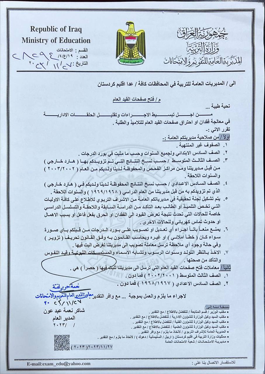 للتقويم والامتحانات منحت عددا من الصلاحيات الخاصة في معالجة فقدان او احتراق صفحات القيد العام للتلاميذ والطلبة الى