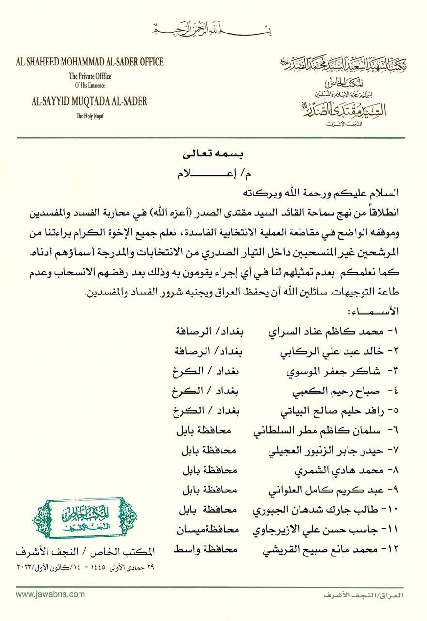 فـي محاربة الفساد والمفسدين وموقفه الواضح فـي مقاطعة العملية الانتخابية الفاسدة، نعلم جميع الإخوة الكرام براءتـنا من مرشحين داخل التيار الصدري رفضوا الانسحاب من الانتخابات".