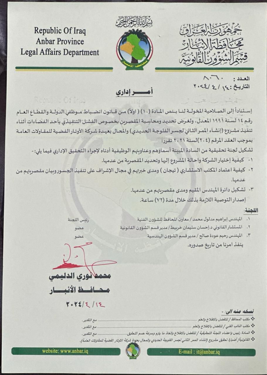 محافظ الأنبار يشكل لجنة تحقيقية تخص "المجسر الحديدي"