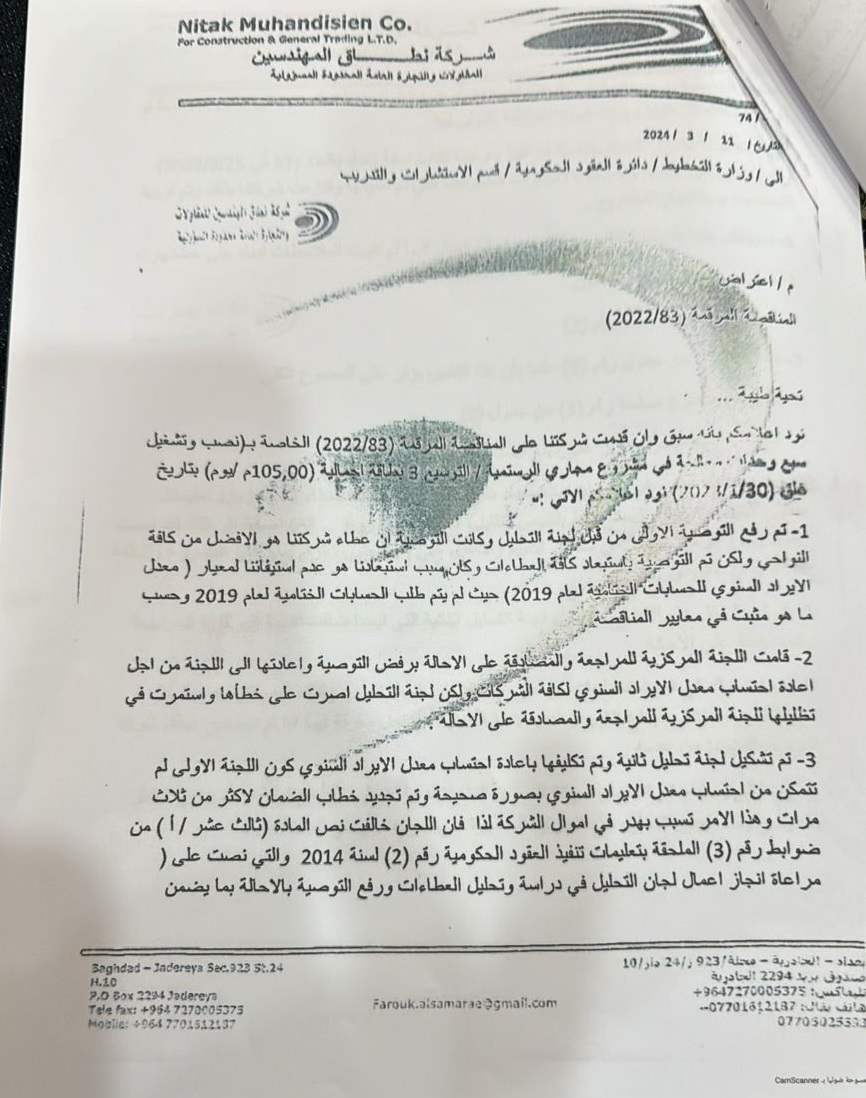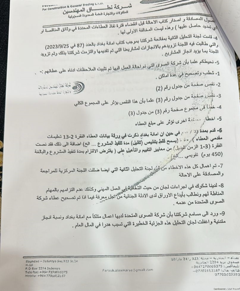 تتضمن اعتراض على المناقصة، ومخاطبة شركة نطاق المهندسين للمقاولات والتجارة العامة