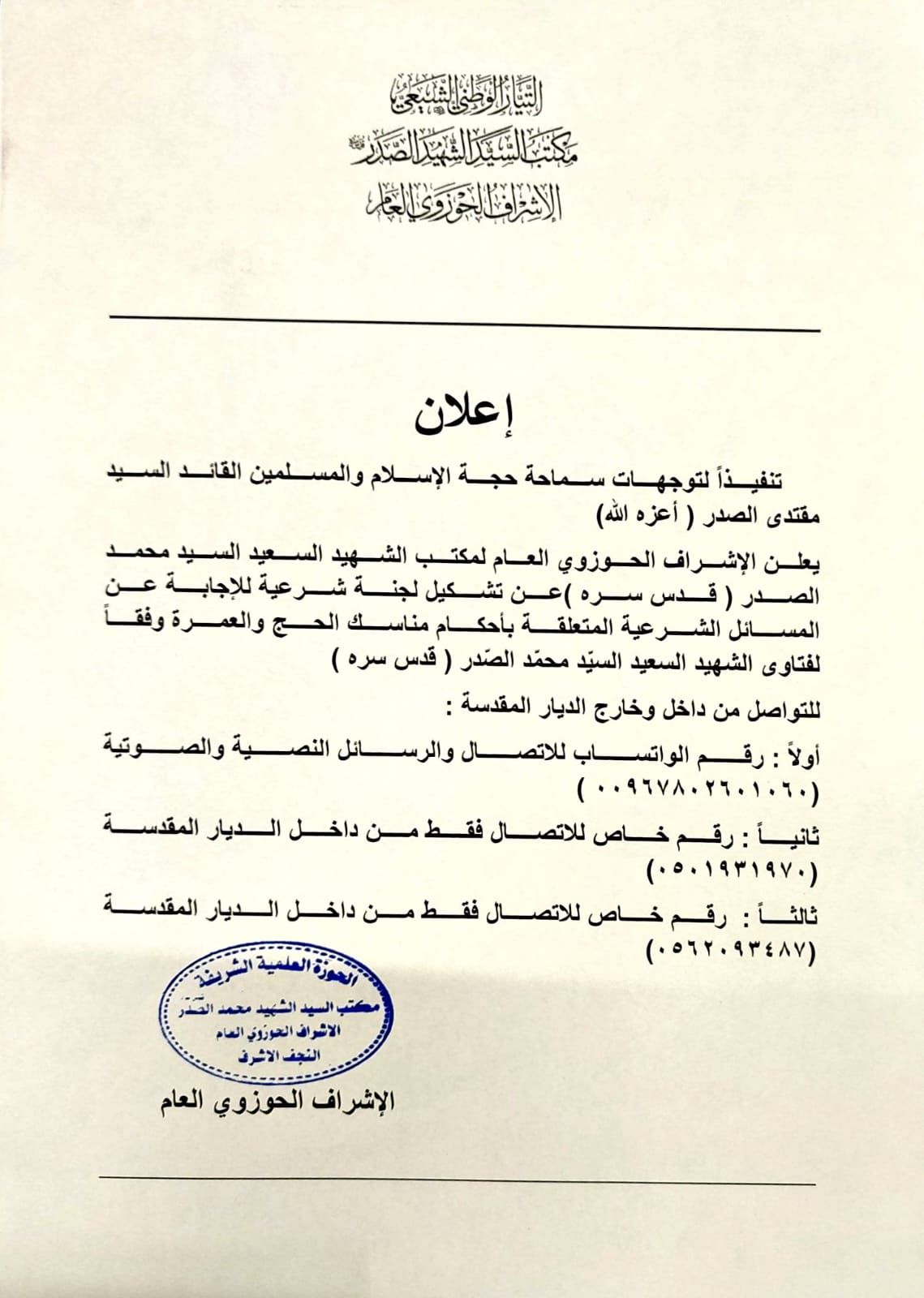 مكتب السيد الصدر يعلن تشكيل لجنة خاصة بأحكام الحج