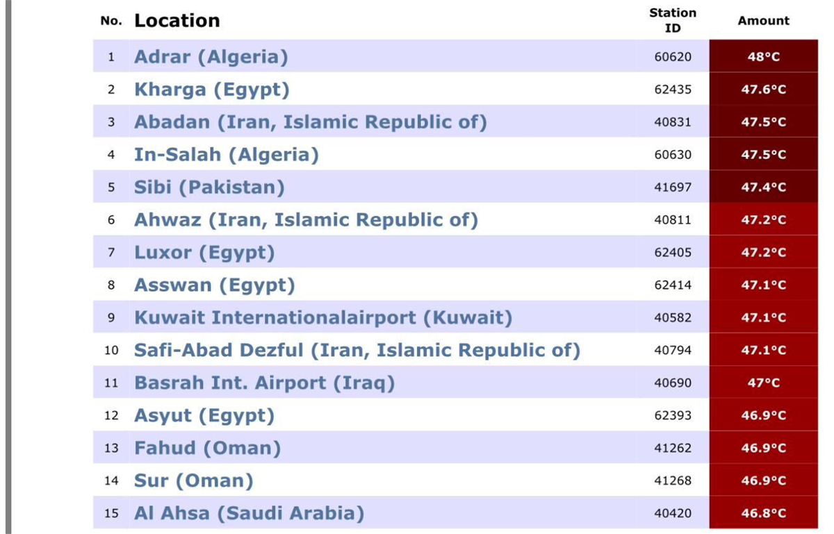 الأمريكية، جدولاً من 15 منطقة ومدينة عالمية سجلت أعلى درجات بالحرارة في العالم خلال آخر 24 ساعة.