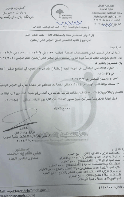 بامراض الكلى للبالغين للعام الدراسي الجديد، فيما اشارت الى الغاء شرط الخدمة سنتين بعد الحصول على بورد الامراض الباطنية.