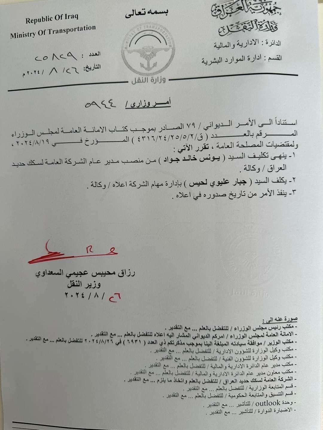 وزير النقل ينهي مهام مدير عام السكك الحديدية (وثيقة)