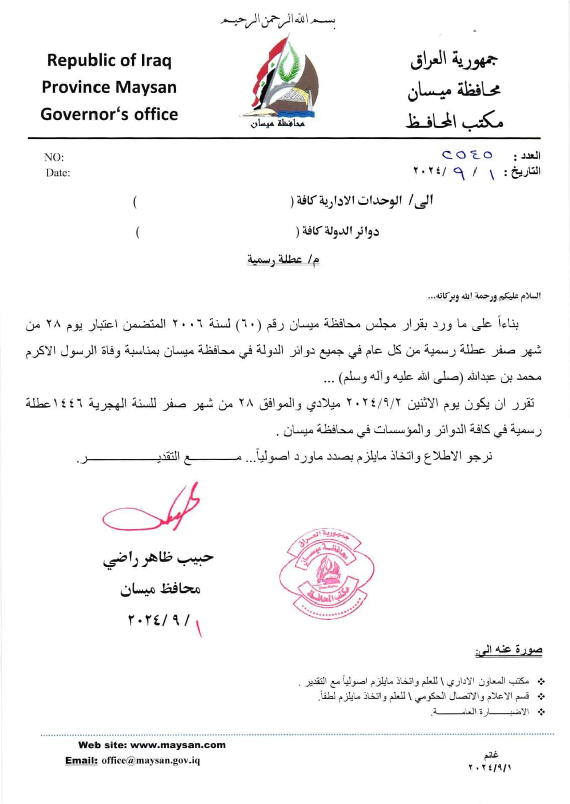 الاكرم (ص)، تقرر ان يكون يوم غد الاثنين عطلة رسمية في كافة الدوائر والمؤسسات بالمحافظة".