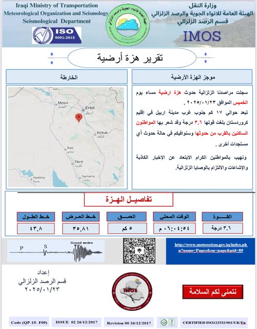، انه "سجلت مراصدنا الزلزالية مساء اليوم الخميس الموافق 23/1/2025حدوث هزة أرضية تبعد حوالي (17) كم