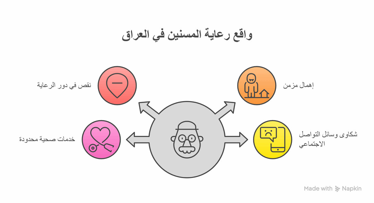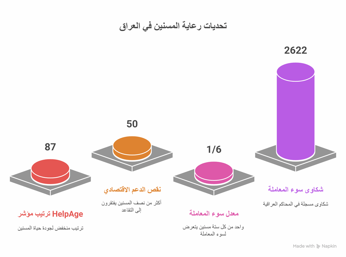 رغم أن العراق يتمتع بتراث حضاري وديني يولي كبار السن منزلة عالية، إلا أن الواقع يشير إلى عكس ذلك، حيث تزداد حالات سوء المعاملة، وتبقى دور الرعاية قليلة وضعيفة التجهيز، فيما تفتقد السياسات الحكومية إلى الرؤية الاستراتيجية للتعامل مع هذه الفئة.