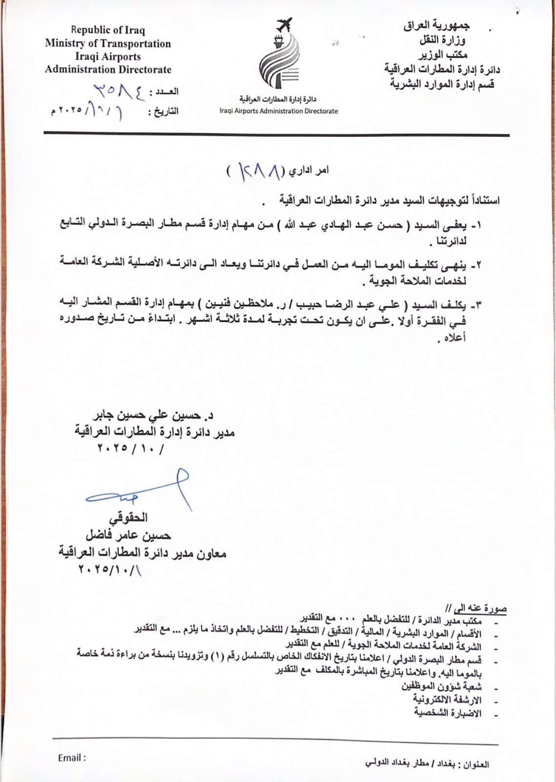 تكليف مدير جديد لمطار البصرة الدولي (وثيقة)