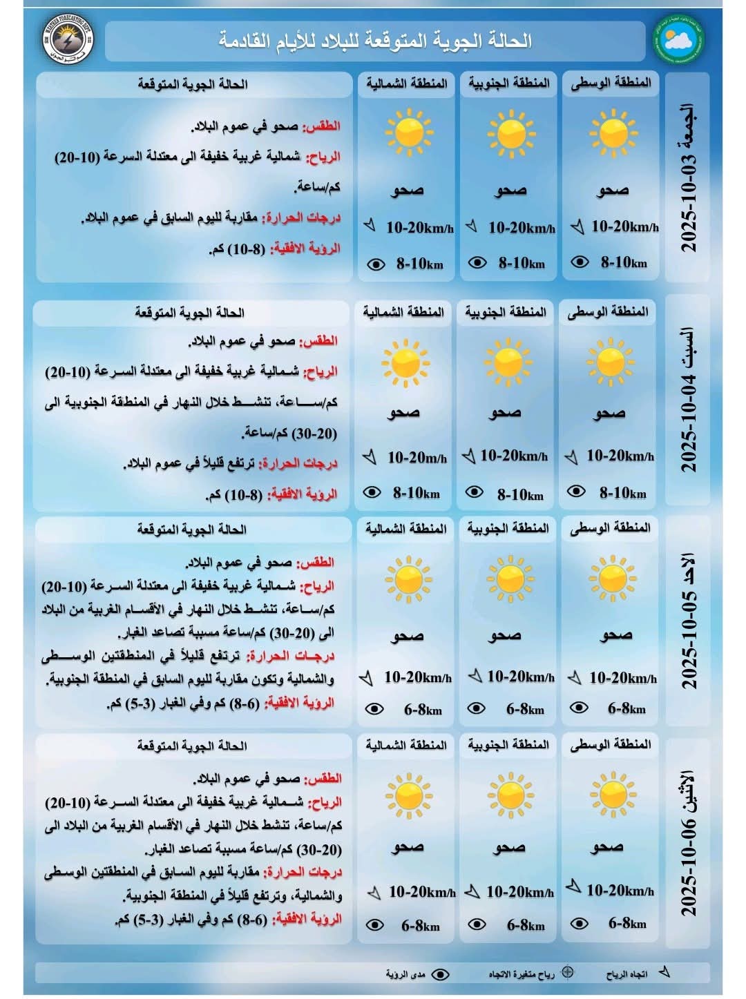 توقعت هيئة الأنواء الجوية، اليوم الخميس، ارتفاعا ملحوظا بدرجات الحرارة في معظم المحافظات مطلع الأسبوع المقبل.