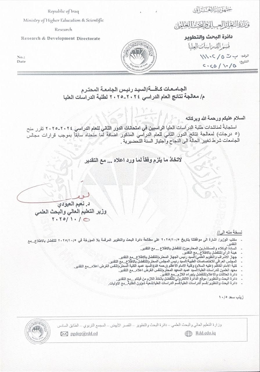والبحث العلمي، على منح (5) درجات معالجة لطلبة الدراسات العليا الراسبين في امتحانات الدور الثاني للعام الدراسي 2024 - 2025.