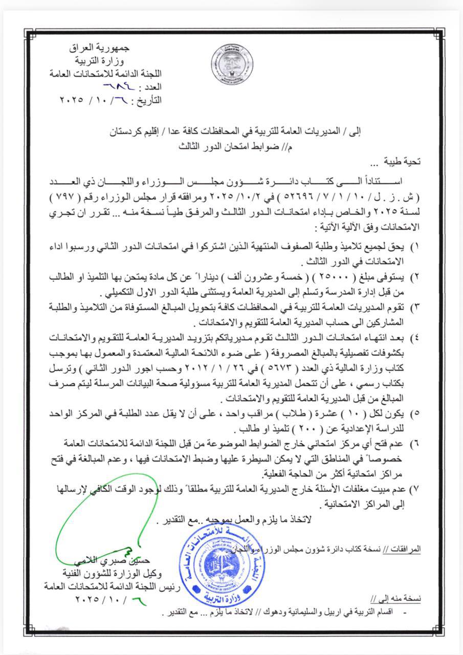 للامتحانات العامة، اليوم الاثنين، ضوابط وآلية اداء امتحانات الدور الثالث للمراحل الدراسية المنتهية/ لعام 2024-2025 على وفق ما ورد في الأدنى: