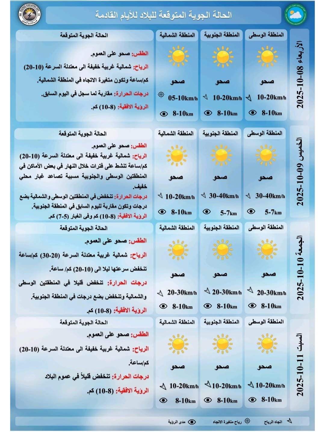 ، ان "طقس يوم غد الاربعاء سيكون صحوا ودرجات الحرارة مقاربة لليوم السابق، مبينة ان "طقس الخميس المقبل سيكون صحوا مع تصاعد غبار في المنطقتين الوسطى والجنوبية ودرجات الحرارة تنخفض في عموم مناطق البلاد".