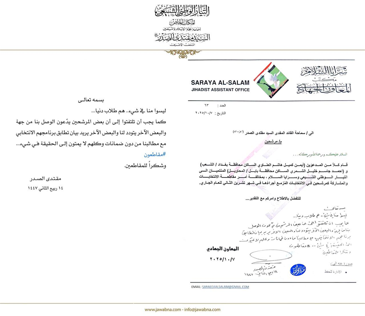 خلال اطلاعه على نشاط سرايا السلام المتضمن أسماء أشخاص ينتمون إلى التيار الشيعي الوطني خالفوا قرار المقاطعة وقاموا بالترشيح للانتخابات، وتابعته