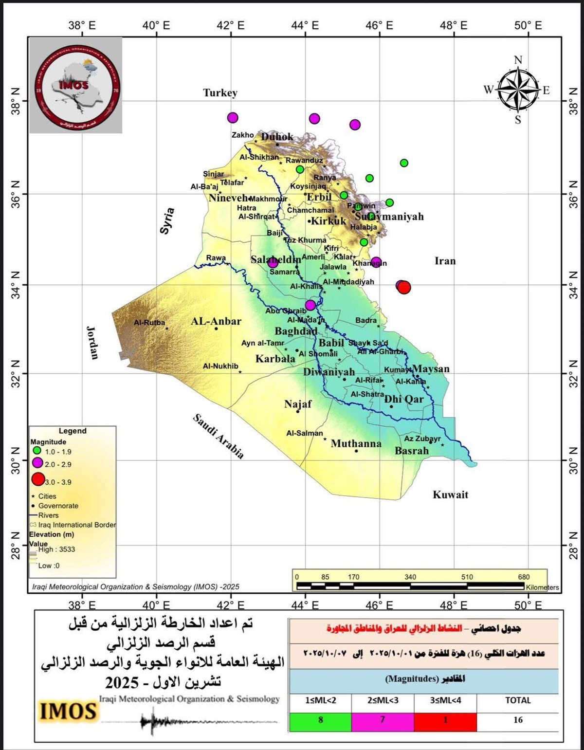 اعلن قسم الرصد الزلزالي، اليوم الثلاثاء، عن تسجيل 16 هزة أرضية خلال اسبوع، 7 منها داخل