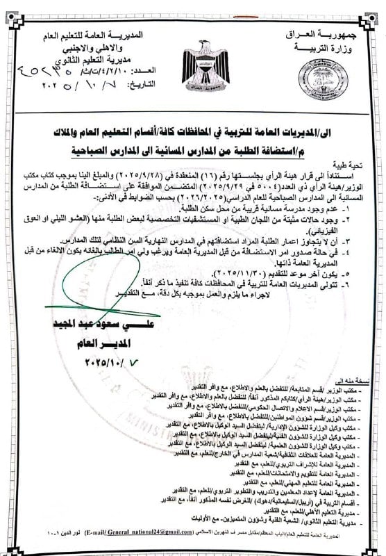 العام والاهلي والاجنبي تفتح ابواب استضافة الطلبة من المدارس المسائية الى المدارس الصباحية للعام الدراسي 2025_2026".